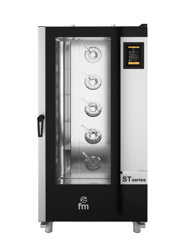 Four mixte de boulangerie avec écran tactile 7", électrique d'une capacité de 16 plaques GN1/1. Contrôle de la température, contrôle de la vapeur, contrôle du ventilateur (10 vitesses). Livre de recettes de boulangerie spécifique.