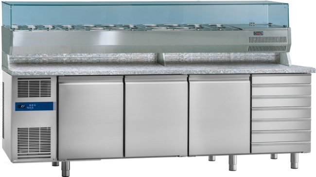 Table pizza avec dosseret et vitrine, 3 portes réfrigérées + 7 tiroirs neutres